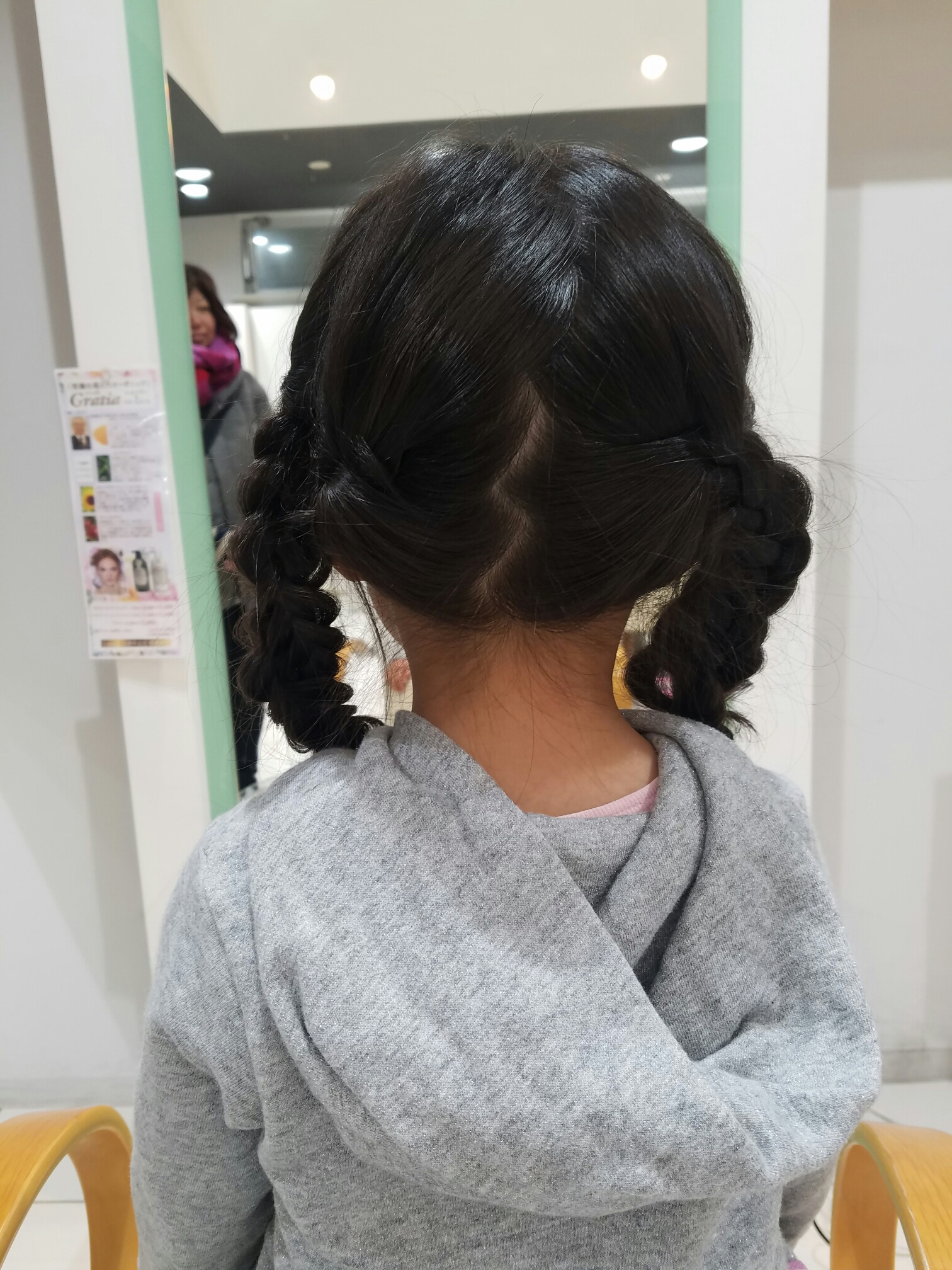 ③2つに分けた髪をさらに2つに分けて2本三つ編みをする。崩してゴムでとめる。