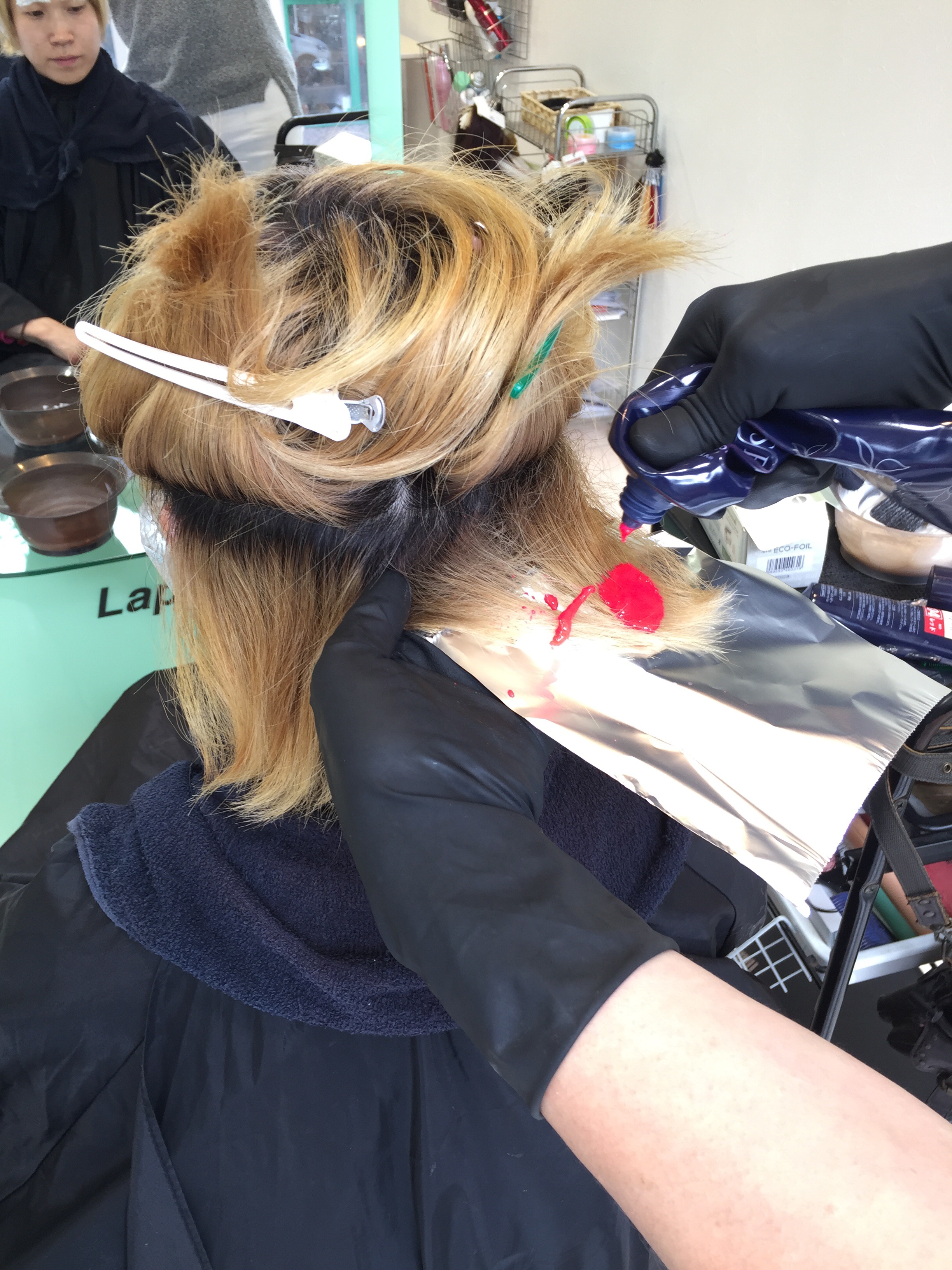 今回はブリーチを二回してあるスタッフをモデルに始めていきます( ͡° ͜ʖ ͡°)