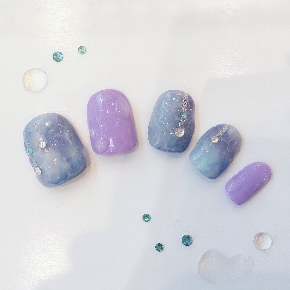 紫陽花色のタイダイに水面ネイルを合わせて