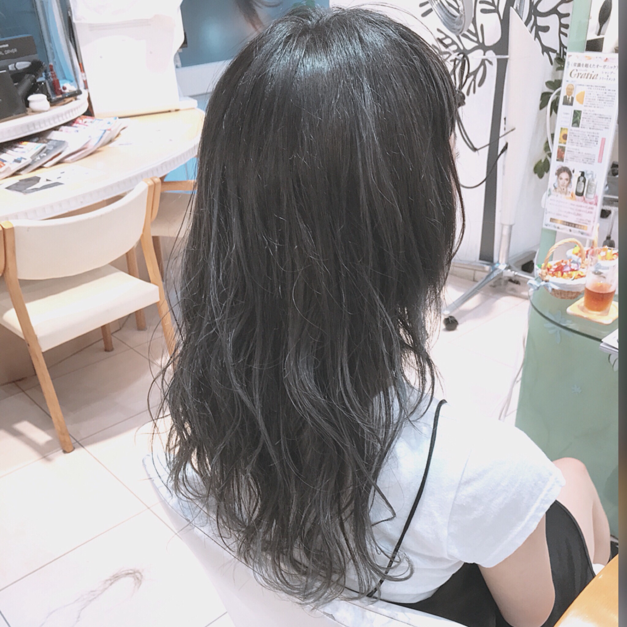 イメージ画像の右側は色味が薄いので、左側の濃い明るさのイメージに近いですが、色味は緑味がでないようにアッシュは控えめにしてパールグレーの色味でカラー💗根元は色落ちしたくないので暗めにカラー!